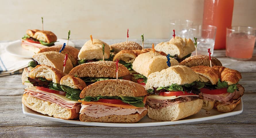 You can’t go wrong with this classic sandwich tray that includes Black Angus roast beef with provolone on baguette, Roasted turkey with Cheddar on 9-grain, and Black forest ham with Swiss on croissant. Sandwiches are catered in a box with each sandwich individually wrapped with pickles and assorted chips including mayo and mustard on the side.