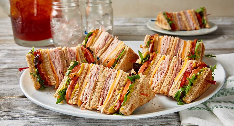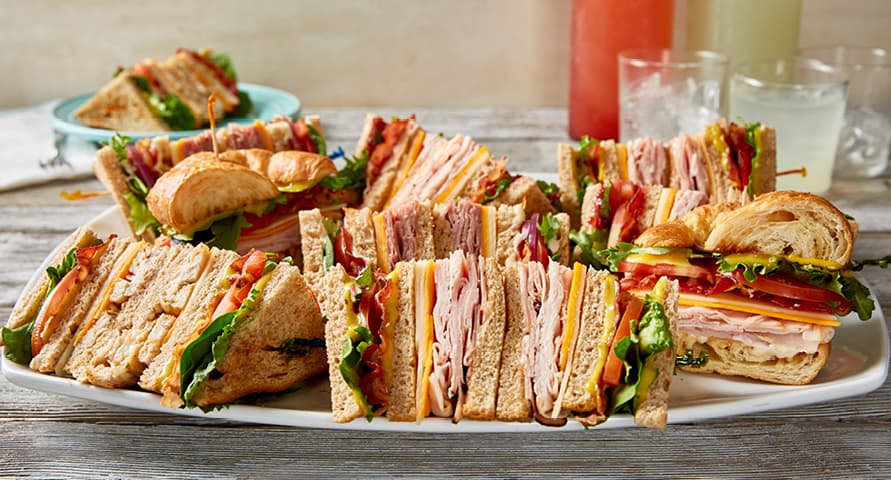 Did you know that our Club sandwich has 13 layers? It's easy to see why the McAlister's Club Tray come dressed to impress. Piled high with Roasted turkey, Black forest ham, Applewood smoked bacon, Sharp cheddar, Swiss cheese, lettuce, tomatoes, McAlister's Honey Mustard™ and mayo on sliced wheat bread. Sandwiches are catered in a box with each sandwich individually wrapped with pickles and assorted chips.