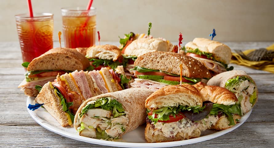 Elevate your next catering event with our Signature Sandwich Tray, full of our most popular sandwiches: McAlister’s Club, Grilled Chicken Caesar Wrap, Harvest Chicken Salad*, Memphian®, and Turkey Ranch BLT. Sandwiches are catered in a box with each sandwich individually wrapped with pickles and assorted chips. *This product contains pecans.